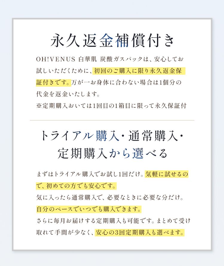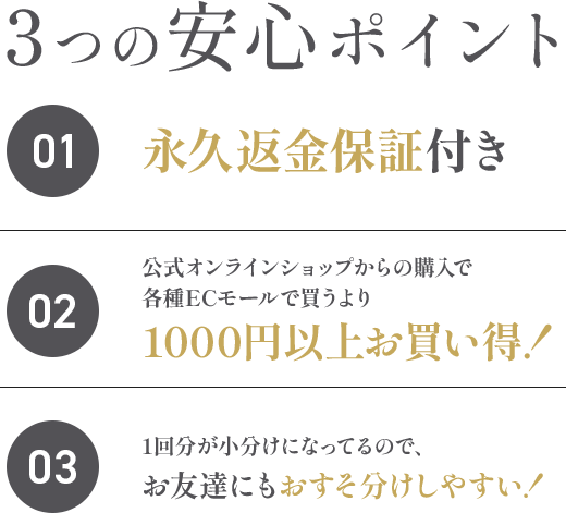 返金保証について 使用後、かゆみなどの症状が出てしまった場合に限り商品をご返品いただけますと初回1個分の商品代金をお返しいたします。