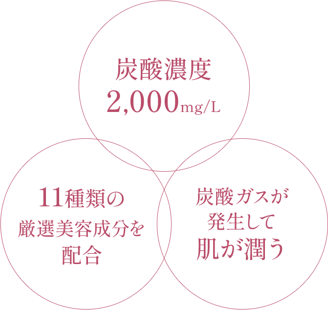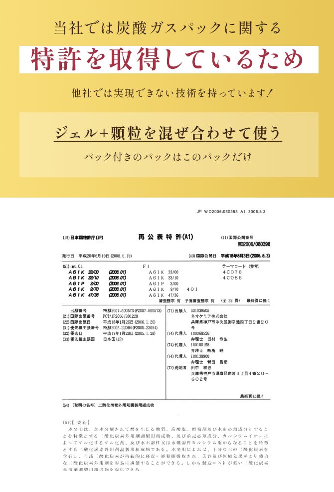 - 当社特許取得の炭酸生成技術を採用した2剤式(A剤:粉末/B剤:ジェル)のパックです。混ぜ合わせることで炭酸ガスが発生し、肌の内側までしっかり浸透します。うるおいとハリを与え、透明感のある肌へ導きます。
